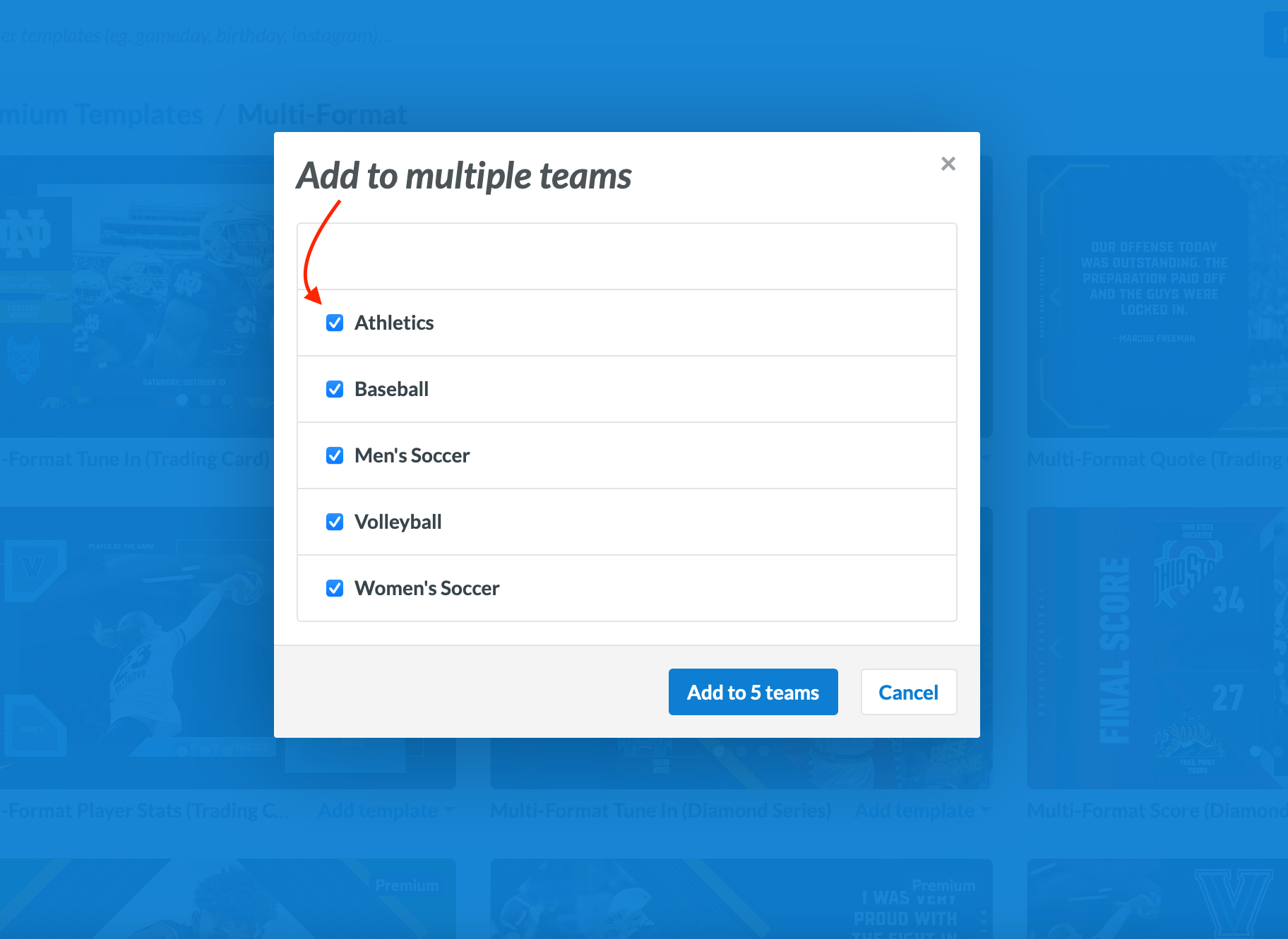 Second, you'll now notice a dropdown menu on the ADD TEMPLATE button. This will give you two options: 1.) Add to that specific team page or 2.) Add to multiple teams.