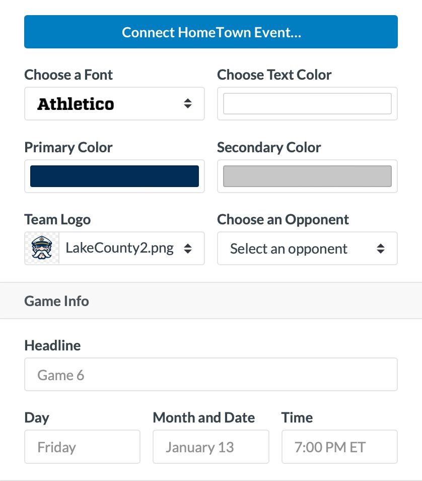 Once you've added a few HomeTown Enabled Graphics to your team, click on one of those templates on your graphics screen under Create a New Graphic. At the top of the form to select all of your graphic data and options, you'll see a new button labeled Connect HomeTown Event.