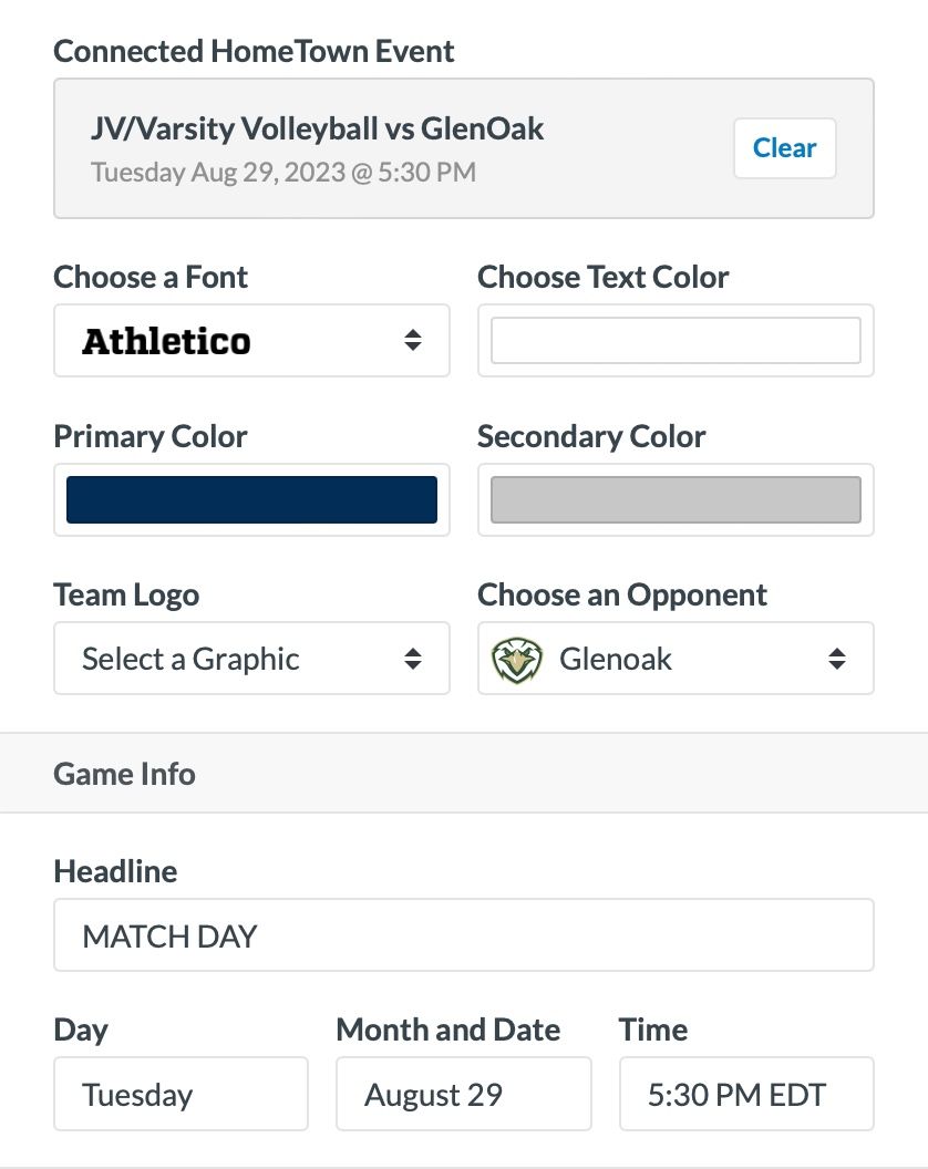 Once you connect an event (or in some templates like schedules or week ahead graphics, multiple events!) Box Out will fill in as much of the template data as it can from your event. We'll even pick the opponent if you've imported them into your Opponents tab.