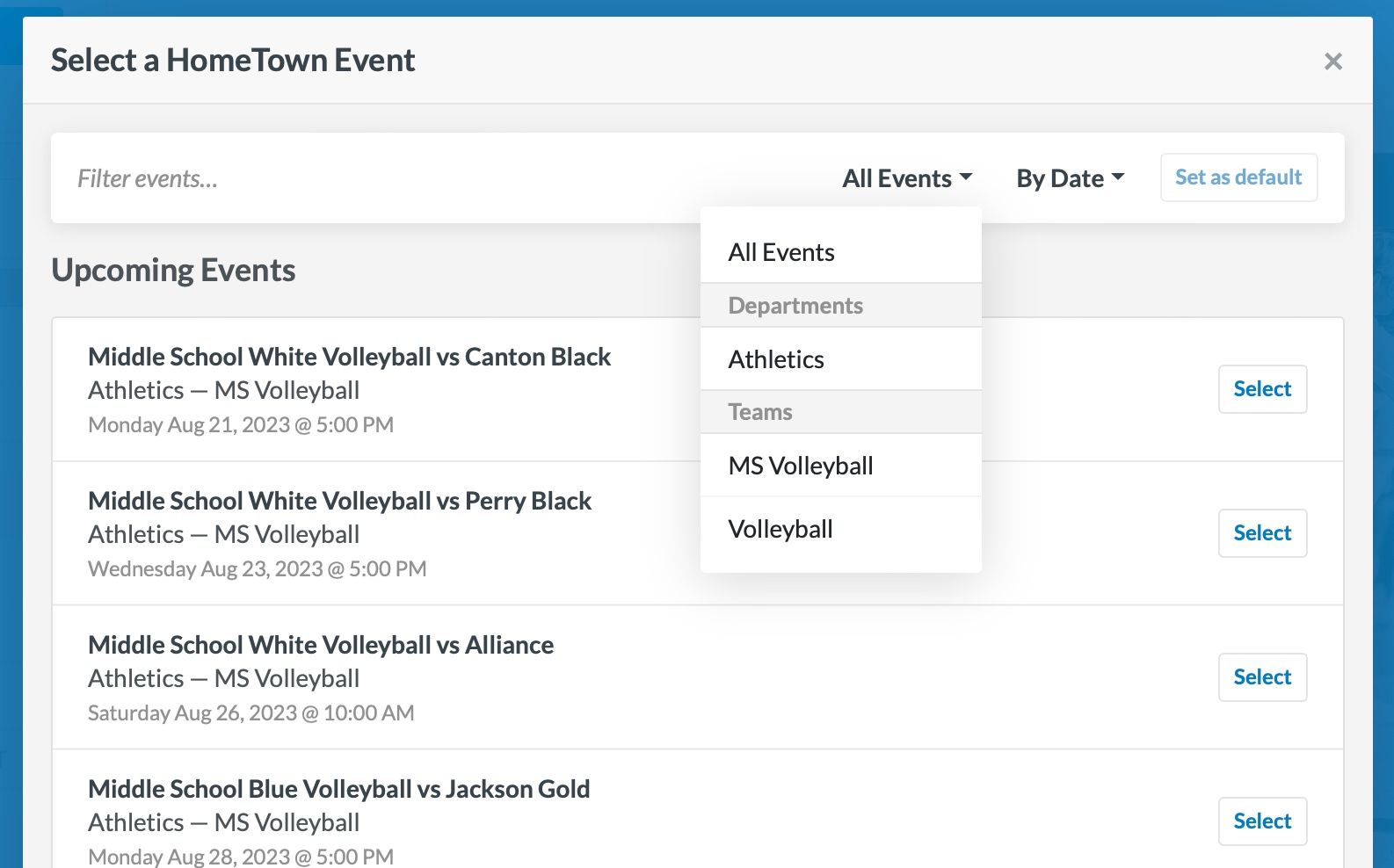 From there, browse through your organizations events. You can search, filter by department, team, sort by date or department, and even save your filters for easily finding events later.