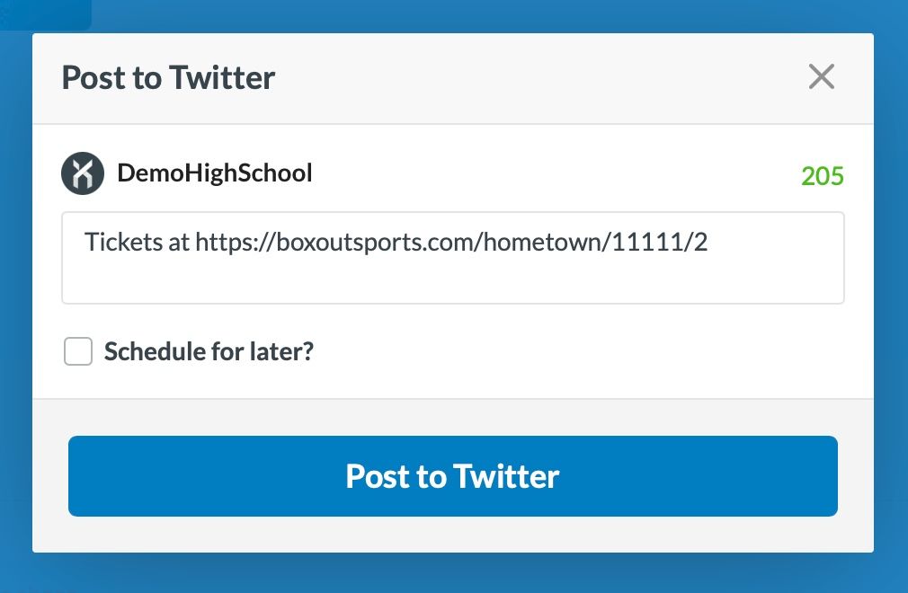 Once you've filled in your text to share, you can post immediately, or use our Schedule feature to post in the future. Use Box Out with HomeTown integration to easily create and schedule all of your Gameday graphics for the next week on a Friday afternoon, including links to buy tickets, and spend the next week focusing on what's important in the moment!