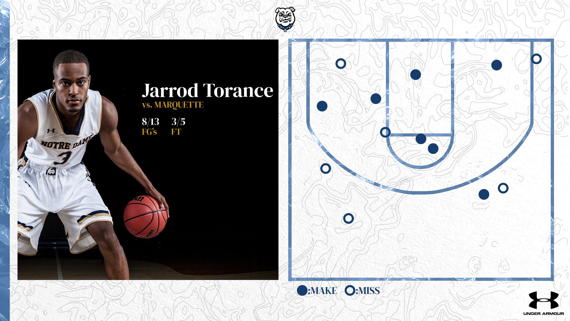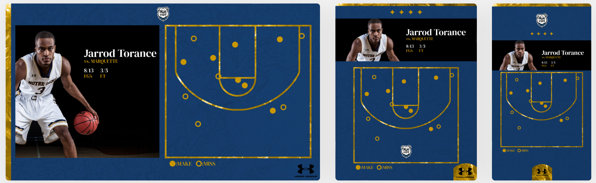 We developed new, game-changing click track technology to create personalized shot charts Made shots are displayed as full circle icons while missed shots are shown with outlined circles Top it off with a player photo, logo & key stats and your shot chart is complete!